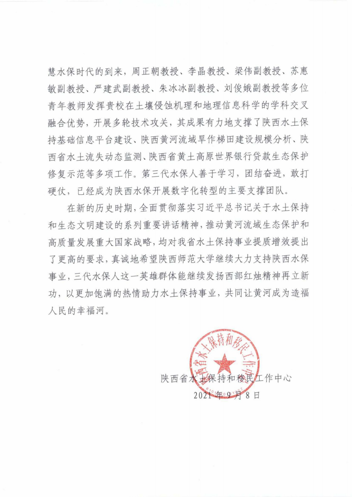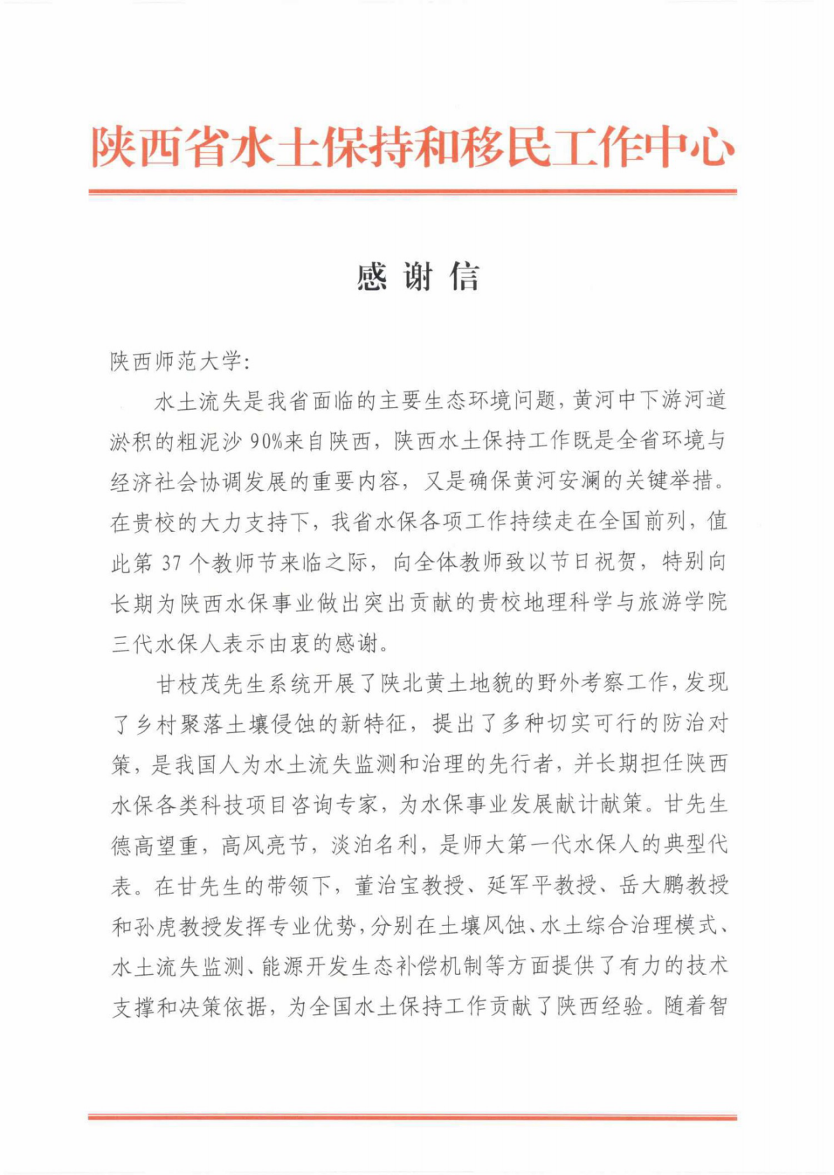 岁物丰成,弦歌不辍。正值第37个教师节,陕西省水土保持和移民工作中心向我校发来感谢信,祝贺全体教师节日快乐。同时,对我院多年来在陕西省水土流失治理工作中做出的突出贡献表示肯定与感谢,对一代代师大人坚持问题导向,推动系统治理,铢积寸累久久为功的高尚品质致以崇高敬意。
