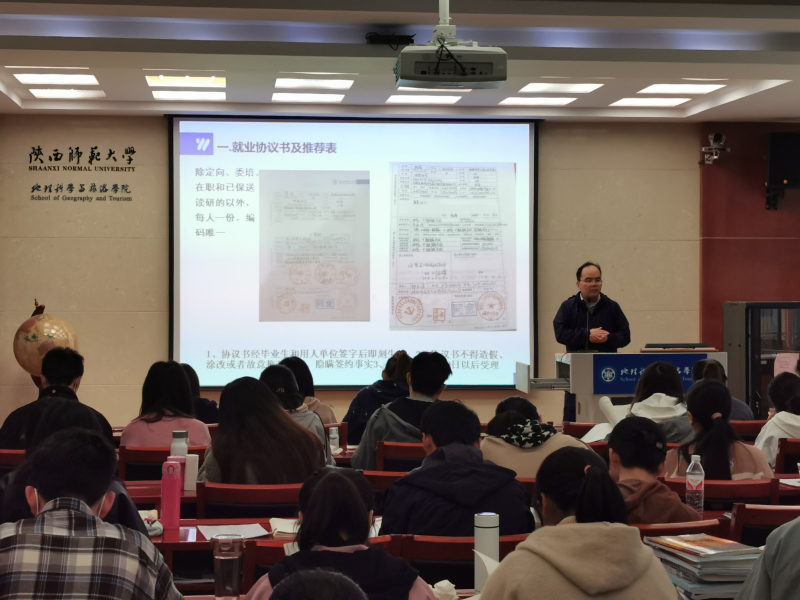 最后,向大家发放了就业协议书和就业推荐表,并强调了就业协议书使用和填写的相关规范。