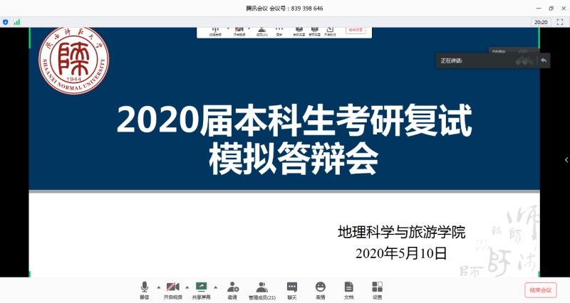 为使考研学子更快速、真实、直接、全面地了解考研复试面试程序,掌握面试技巧,提升复试信心,248cc永利集团于5月10日下午成功举办2020年考研同学模拟面试云答辩。本次模拟面试答辩分别邀请到来自自然、人文、地信、环境、旅游专业等5位专家教授担任评委,参加复试答辩的70余名同学参加。答辩会由副书记郝高建主持。