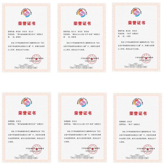 本次大赛吸引了众多优秀的师范生、高校老师和一线地理教师参加比赛,最终共收到1000多个作品。经高考命题专家及团队匿名分组评审、编辑部审定,最终评选出特等奖29个。在248cc永利集团李双双老师指导下,经过精心的准备和设计,郭世爽同学的参赛作品《“渭河盆地地貌及演化历史”试题设计》和张正方同学的参赛作品《“秦岭太白山云海-石河-林线”试题设计》荣获特等奖,黄圣炜同学的参赛作品《“泉州”试题设计》荣获二等奖。李双双老师被评为优秀指导教师。