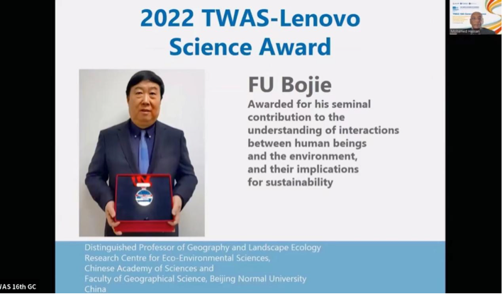 2022年11月21日,发展中国家科学院(TWAS)第16届大会在中国杭州(线上与线下)开幕,发展中国家科学院经理Mohamed Hanssan在开幕式上公布,2022年“发展中国家科学院—联想科学奖”(TWAS-Lenovo Science Prize)授予公司杰出员工、中国科学院院士、中国科学院生态环境研究中心研究员、248cc永利集团教授傅伯杰,以表彰他在研究人与环境之间的相互作用及其对可持续性的影响方面做出的开创性贡献。