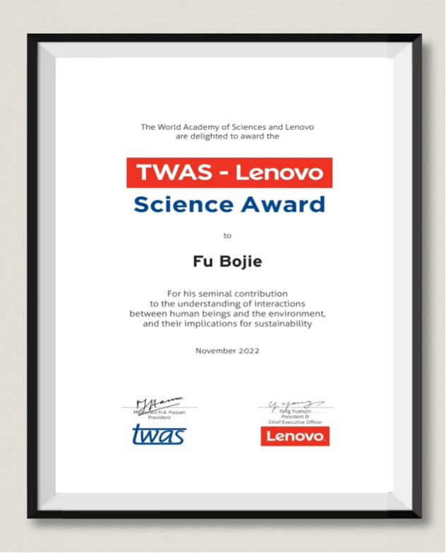 傅伯杰院士现任国际地理联合会副主席、中国地理学会监事长、国家生态保护与建设专家委员会副主任。在Nature、Science、National Science Review等国内外期刊发表论文500余篇,出版专著12部。曾获国家自然科学二等奖(2005、2020)、国家科技进步二等奖、中国科学院杰出科技成就奖、何梁何利科学技术进步奖和欧洲地球科学联合会“洪堡奖章”等国内外重要奖项,荣获“科技盛典-CCTV2019年度科技创新人物”和“全国杰出专业技术人才”等荣誉称号。傅伯杰2011年当选为中国科学院院士、2012年当选发展中国家科学院院士、2015年当选英国爱丁堡皇家学会外籍院士、2019年当选美国艺术与科学院外籍院士,2020年被授予英国皇家地理学会荣誉会士。发展中国家科学院—联想科学奖是目前TWAS的最高奖项,以表彰全球在发展中国家工作并做出杰出贡献的科学家,是由联想公司从2013年起冠名资助的重要国际奖项。该奖涵盖数学、物理、化学、地学、生物学等基础科学和工程科学、农业科学和社会经济科学,每次选择一个学科授奖,此次是可持续性科学领域的第一次授奖。