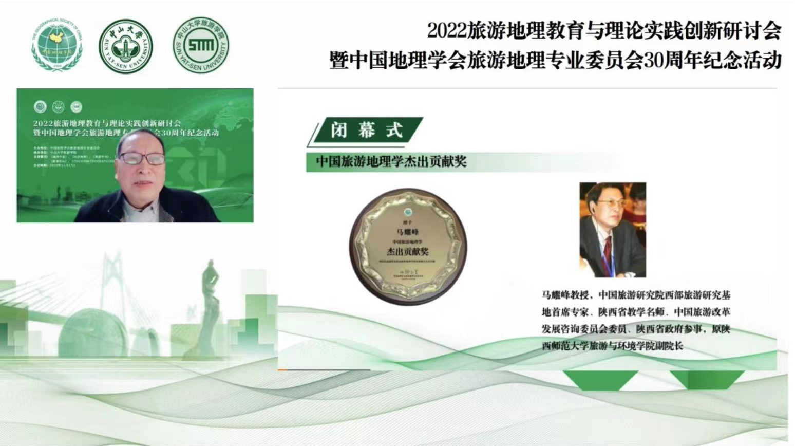 2022年11月27日,旅游地理教育与理论实践创新研讨会暨中国地理学会旅游地理专业委员会30周年纪念活动正式召开,该会议由中国地理学会旅游地理专业委员会主办,由中山大学旅游学院承办。会议回顾了我国旅游地理学的发展历程与贡献,探讨了旅游地理教育与理论实践创新的前沿议题,展望了新时代旅游地理学的发展愿景。该会议设置中国旅游地理学杰出贡献奖,由中国地理学会旅游地理专业委员会组织专家评选,特别表彰在旅游地理学领域具有杰出贡献的两位学者。248cc永利集团马耀峰教授获此殊荣。