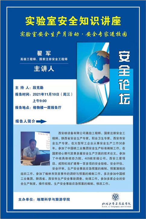 作为2021年实验室安全生产月重要活动内容之一:安全专家进校园,实验中心邀请到了我市安全应急管理专家、国家注册安全工程师翟军老师,针对公司各类实验室存在的安全隐患进行一次专项讲座,欢迎广大师生前来参会。